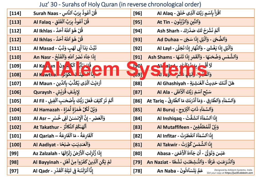 Juzʼ 30 Surah's Names of Holy Quran (in reverse chronological order)